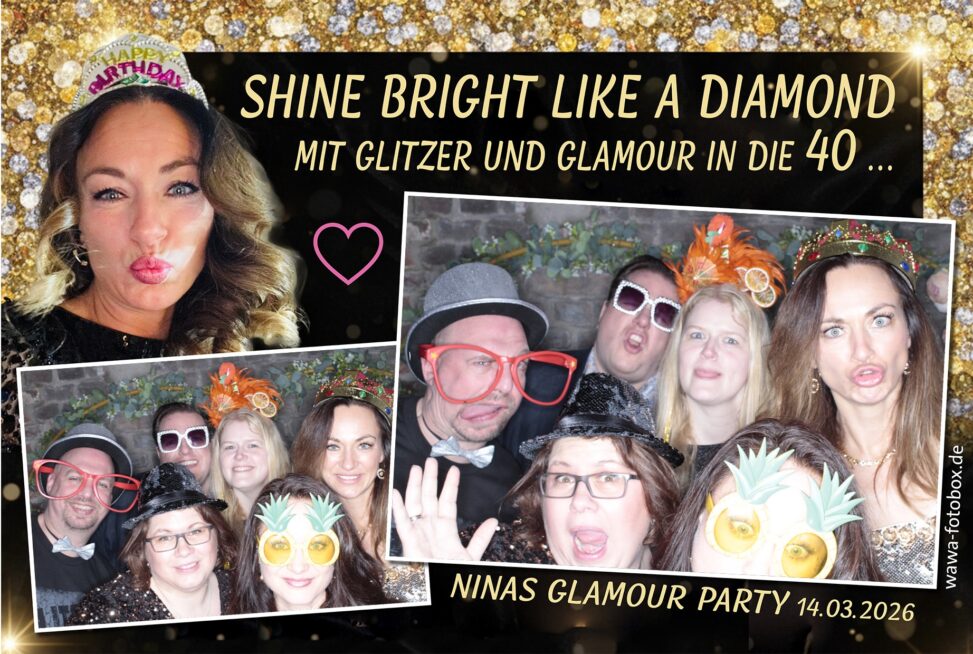Außerdem gratulieren wir Nina ganz herzlich zum 40. Geburtstag – wünschen dir und deinen Gästen viel Freude beim Durchstöbern der vielen glitzernden Momente und unvergesslichen Fotos von diesem besonderen Abend!“